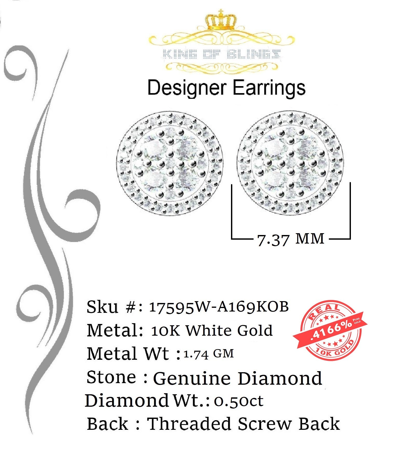 The Round Shape Stud earrings feature a classic stud Earring comes with threaded screw backs, ensuring a secure and comfortable fit. Crafted from Real 10k White Gold , these Men's earrings boast a lustrous White metal color , enhancing the overall elegance.The main attraction lies in the real diamonds that adorn these earrings, bringing a sense of luxury and brilliance to the wearer. While specific details such as the diamond weight 0.5 and 1.74gm