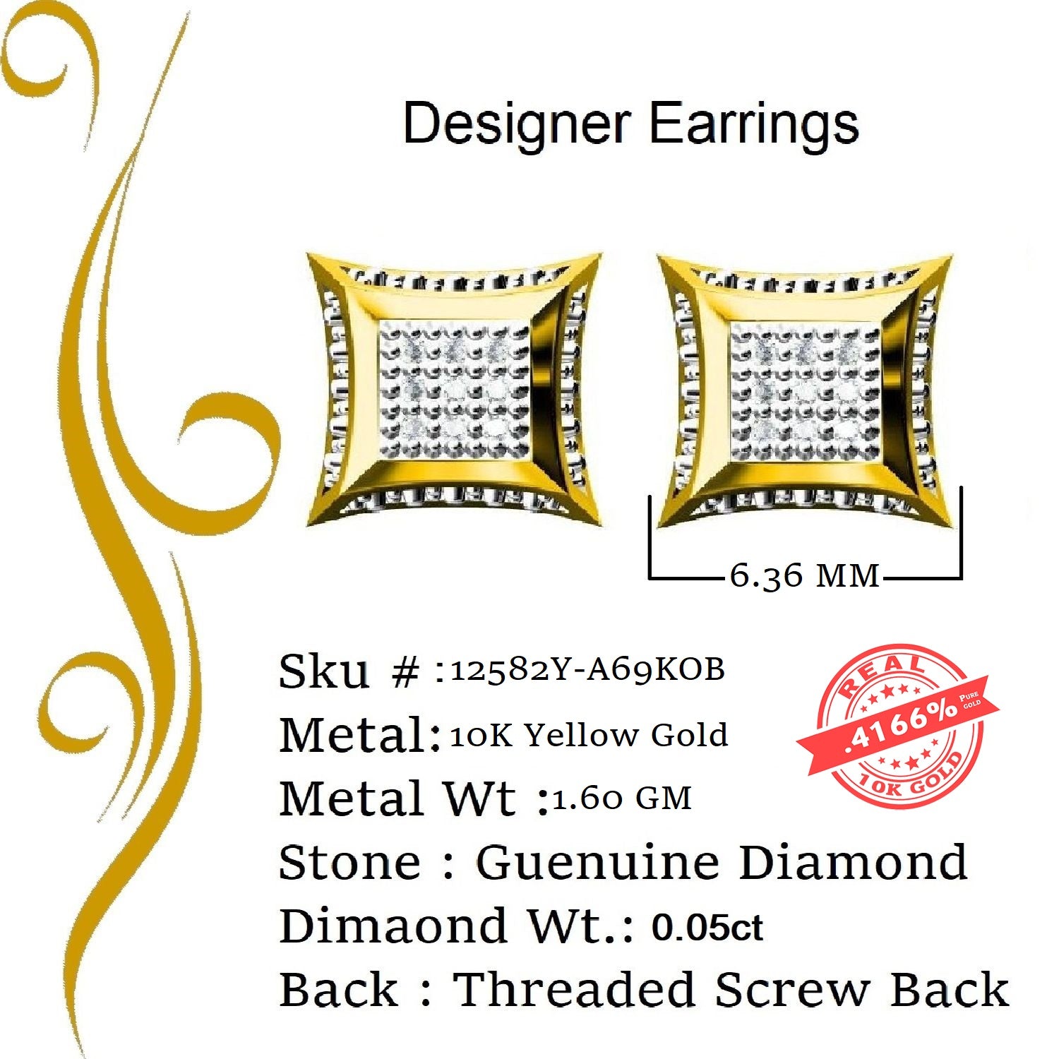 The Square Shape Stud earrings feature a classic stud Earring comes with threaded screw backs, ensuring a secure and comfortable fit. Crafted from Real 10k Yellow Gold , these Men's earrings boast a lustrous Yellow metal color , enhancing the overall elegance.The main attraction lies in the real diamonds that adorn these earrings, bringing a sense of luxury and brilliance to the wearer. While specific details such as the diamond weight 0.05 and 1.60 gm