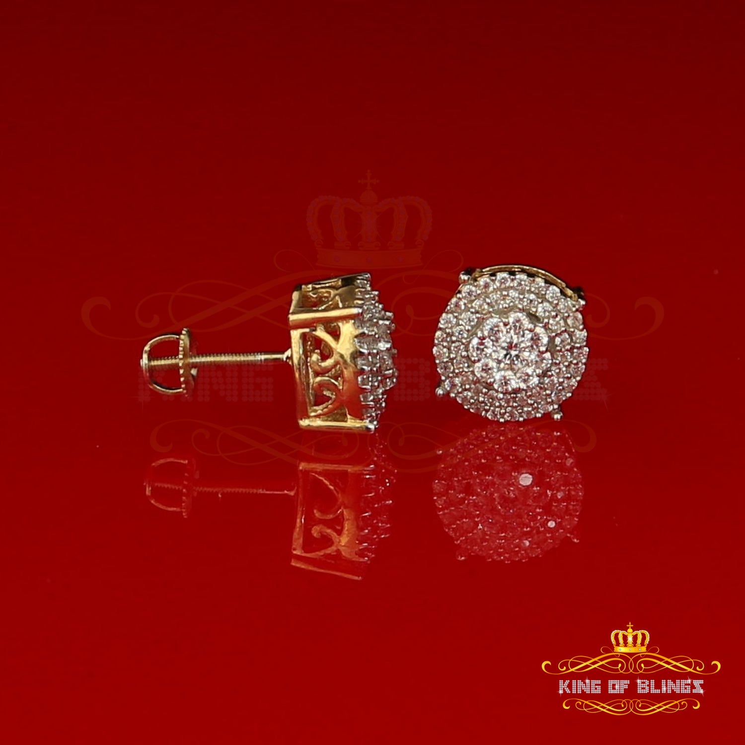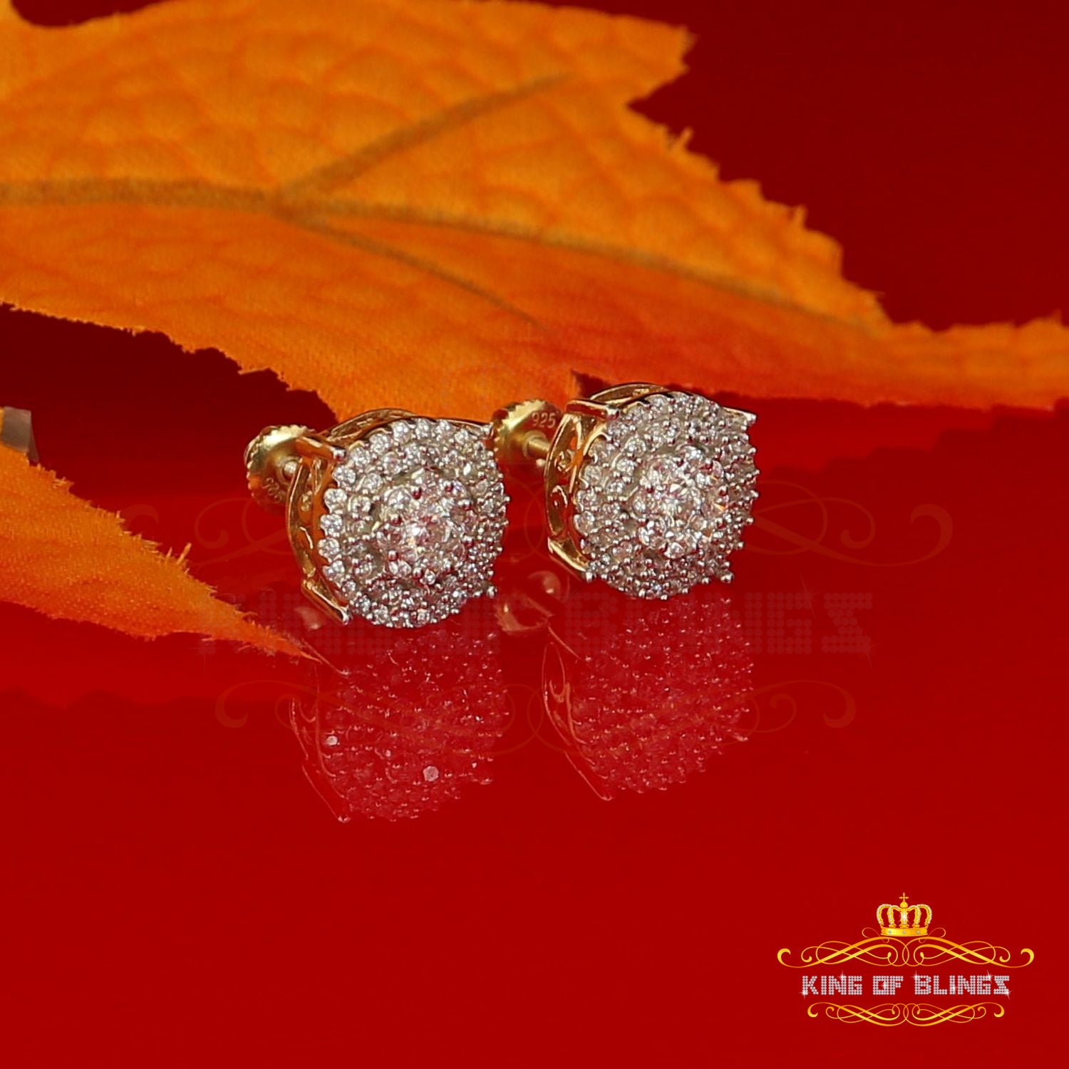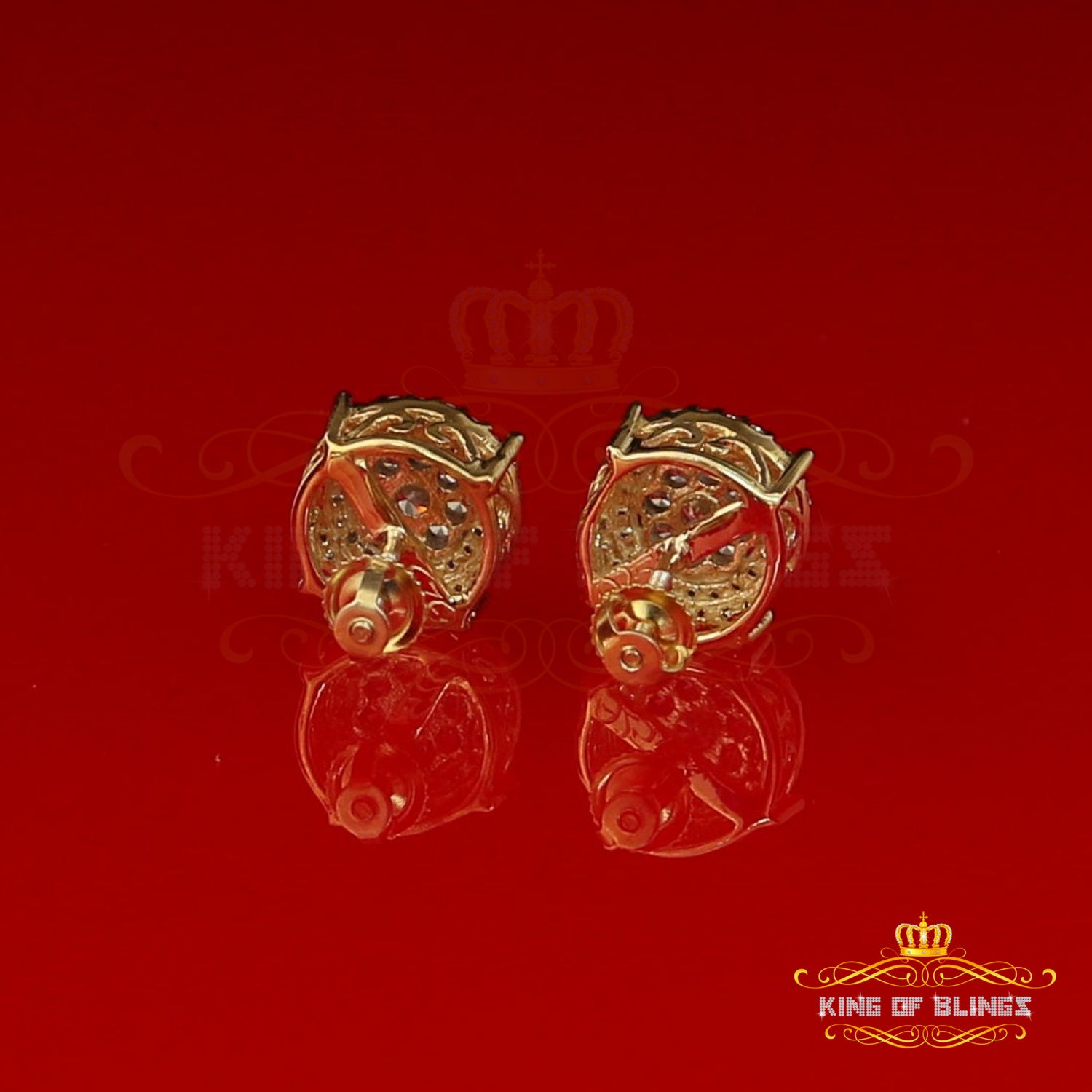 Step into a world of King Of Blings dazzling elegance and allure with our exclusive collection of Round Cubic Zirconia stud earrings featuring secure screw backs. Indulge yourself or surprise a loved one with these exquisite earrings crafted from premium 925 sterling silver with metal weight 3.27gm and CZ weight of 0.83ct, boasting a lustrous Yellow metal color that exudes sophistication. The real show-stoppers, however, are the meticulously chosen AAA Grade and 'D' Color Cubic Zircon stones. Radiating luxury and brilliance, these stones are carefully graded for clarity and color, ensuring a mesmerizing sparkle that rivals even the most precious diamonds.