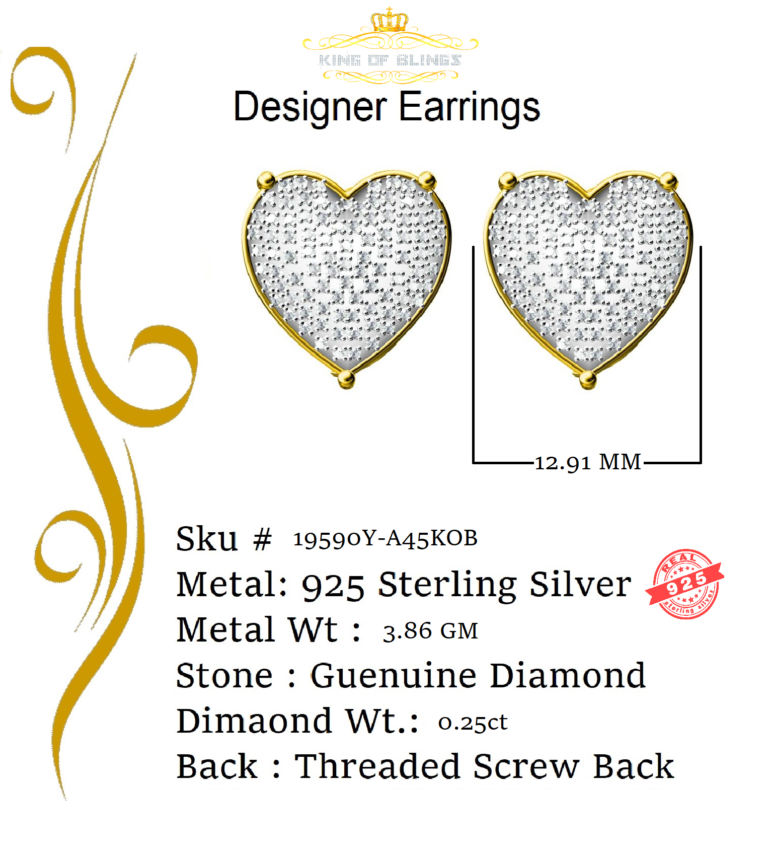 King of Blings-Style Heart 925 Yellow Silver 0.25ct Diamond Women's & Men's Fashion Earrings