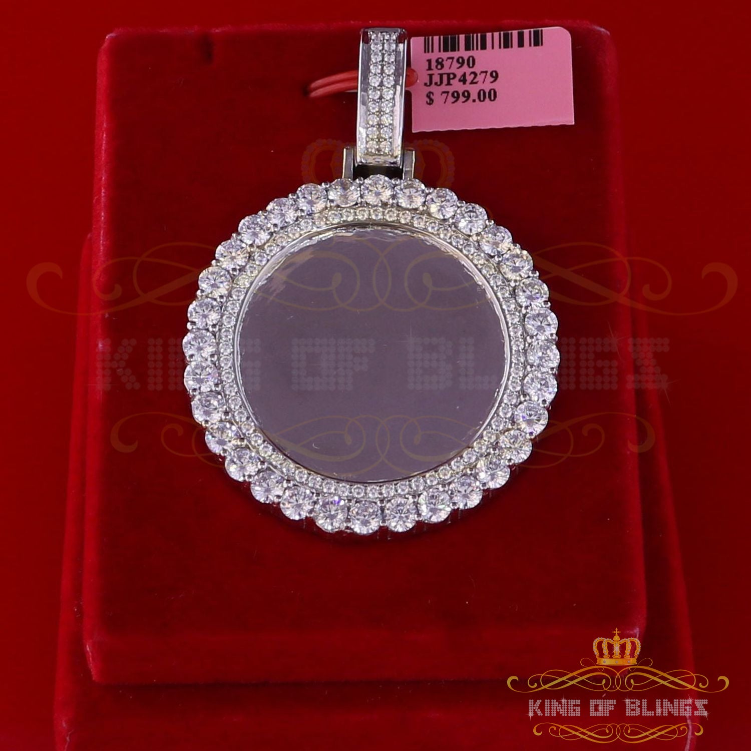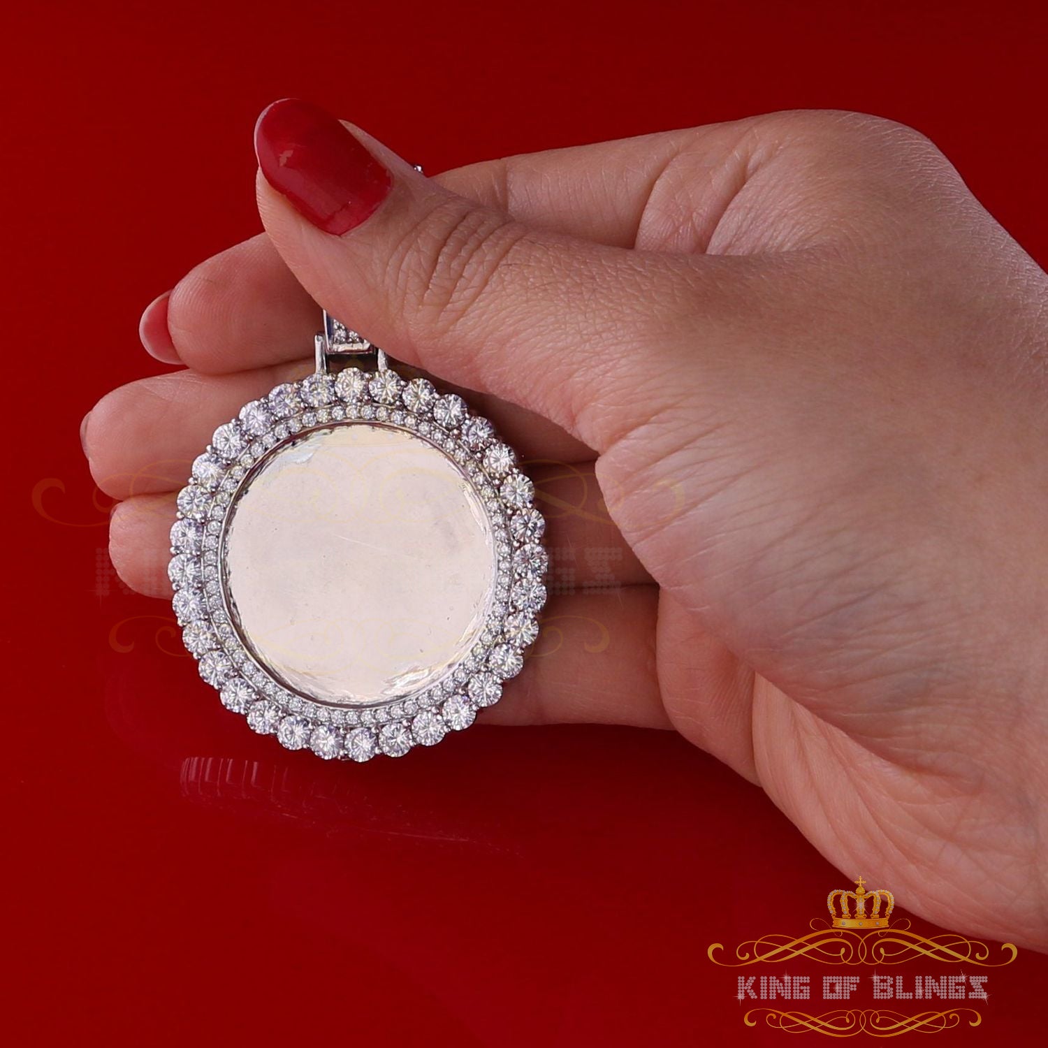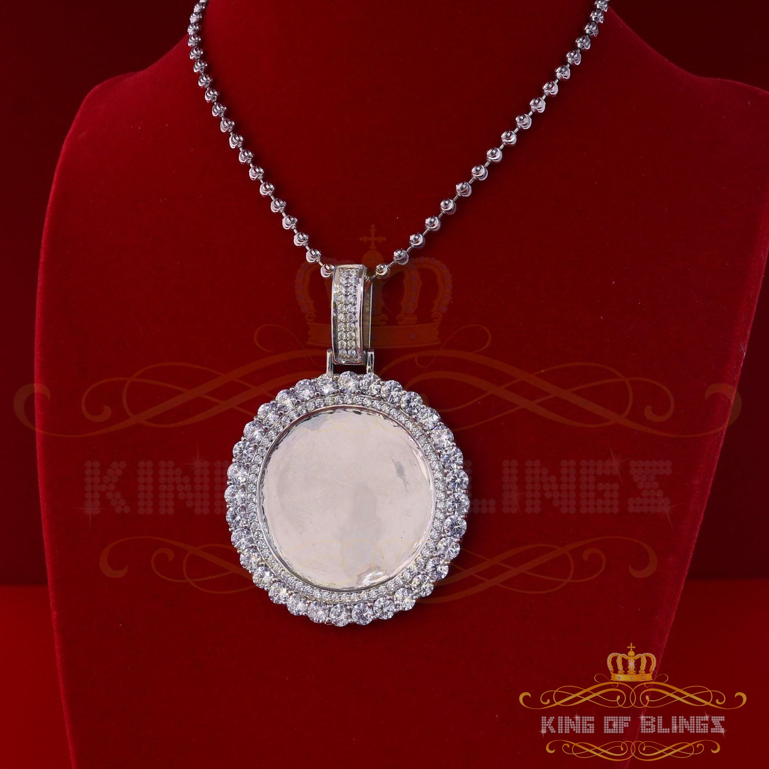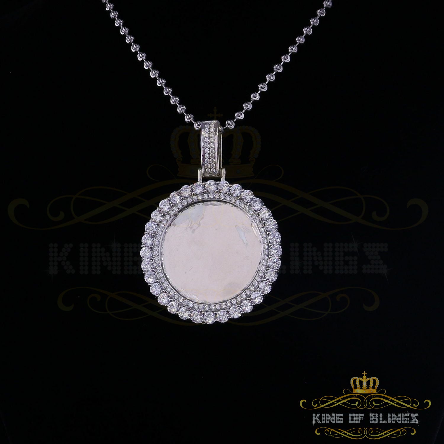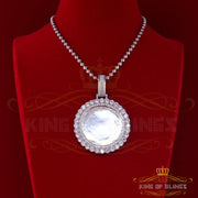 Special memories are never to be forgotten with this personalized and engravable diamond frame medallion photo pendant. Handcrafted, customized photo pendant brings a unique way to honor your loved ones, relatives and friends by allowing you to hold their memories with you in every moment. Your picture will be cropped to fit perfectly into the image area, covered by a protective glass bubble that allows you to see the image from all angles with a reflecting 3D effect. This pendant Made in 925 White Silver got 29.56 gm and Sparkling AAA grade Cubic Zircon weight 15.09ct makes for the perfect holiday gift. A unique way to express your love.