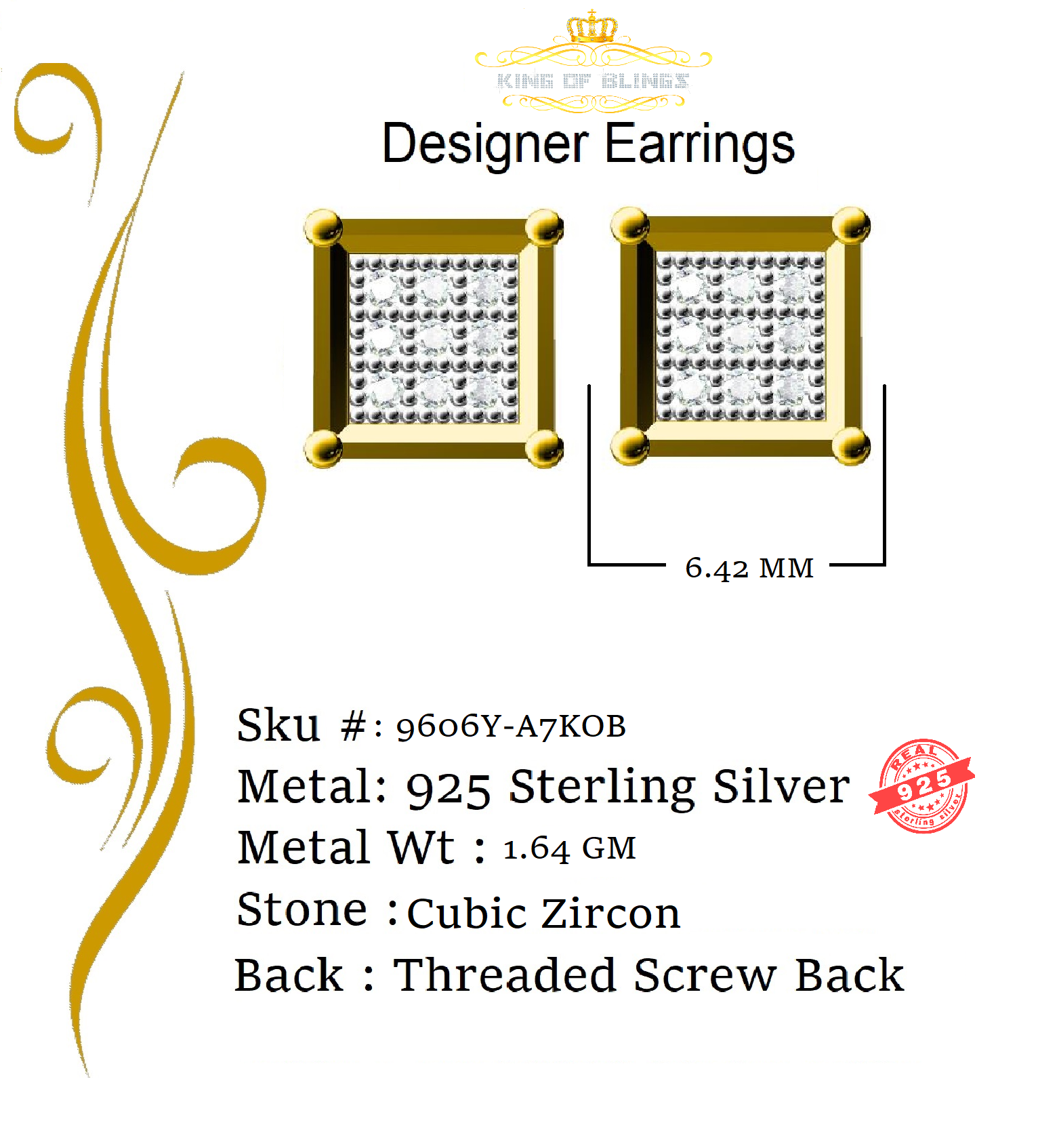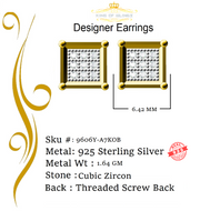 Step into a world of dazzling elegance and allure with our exclusive collection of Cubic Zirconia stud earrings featuring secure screw backs. Indulge yourself or surprise a loved one with these exquisite earrings crafted from premium 925 sterling silver with metal weight 1.64gm and CZ weight of 0.14ct, boasting a lustrous Yellow metal color that exudes sophistication. The real show-stoppers, however, are the meticulously chosen AAA Grade and 'D' Color CZ stones. Radiating luxury and brilliance, these stones are carefully graded for clarity and color, ensuring a mesmerizing sparkle that rivals even the most precious diamonds.